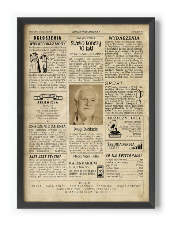 Personalizowany plakat na urodziny w stylu starej gazety to wyjątkowy prezent, który wywoła uśmiech na niejednej twarzy ☺. Ważne wydarzenia z roku narodzin, muzyczne przeboje i popularne filmy, seriale z tamtego okresu czy choćby mini-kalendarium z dnia narodzin sprawiają, że plakat staje się nie tylko interesującą podróżą w czasie, ale także wyjątkową pamiątką, która może wzbudzić emocje i sentymenty obchodzącej urodziny osoby.