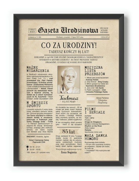 Personalizowany plakat na urodziny w stylu starej gazety to wyjątkowy prezent, który wywoła uśmiech na niejednej twarzy☺. Ważne wydarzenia z roku narodzin,muzyczne przeboje i popularne filmy, seriale z tamtego okresu czy choćby mini-kalendarium z dnia narodzin sprawiają, że plakat staje się nie tylko interesującą podróżą w czasie, ale także wyjątkową pamiątką, która może wzbudzić emocje i sentymenty obchodzącej urodziny osoby.