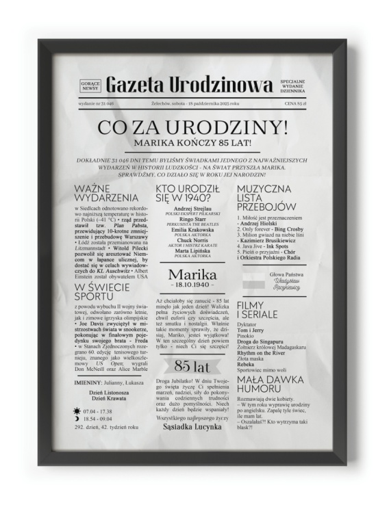 🔷 PERSONALIZOWANY NAGŁÓWEK - tutaj zamieszczamy miejscowość zamieszkania i datę urodzin (które odpowiadają miejscowości i dacie wydania "gazety"); dodatkowo, pod spodem dostosowujemy treść do konkretnej osoby,